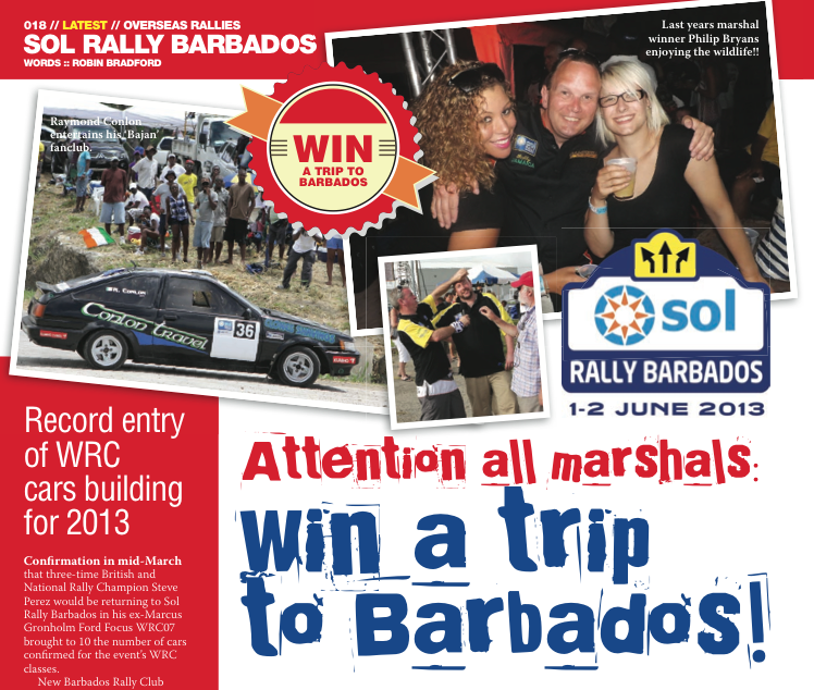 Attention all marshals: win a trip to Barbados! One-page update on Sol Rally Barbados 2013, plus advertisement