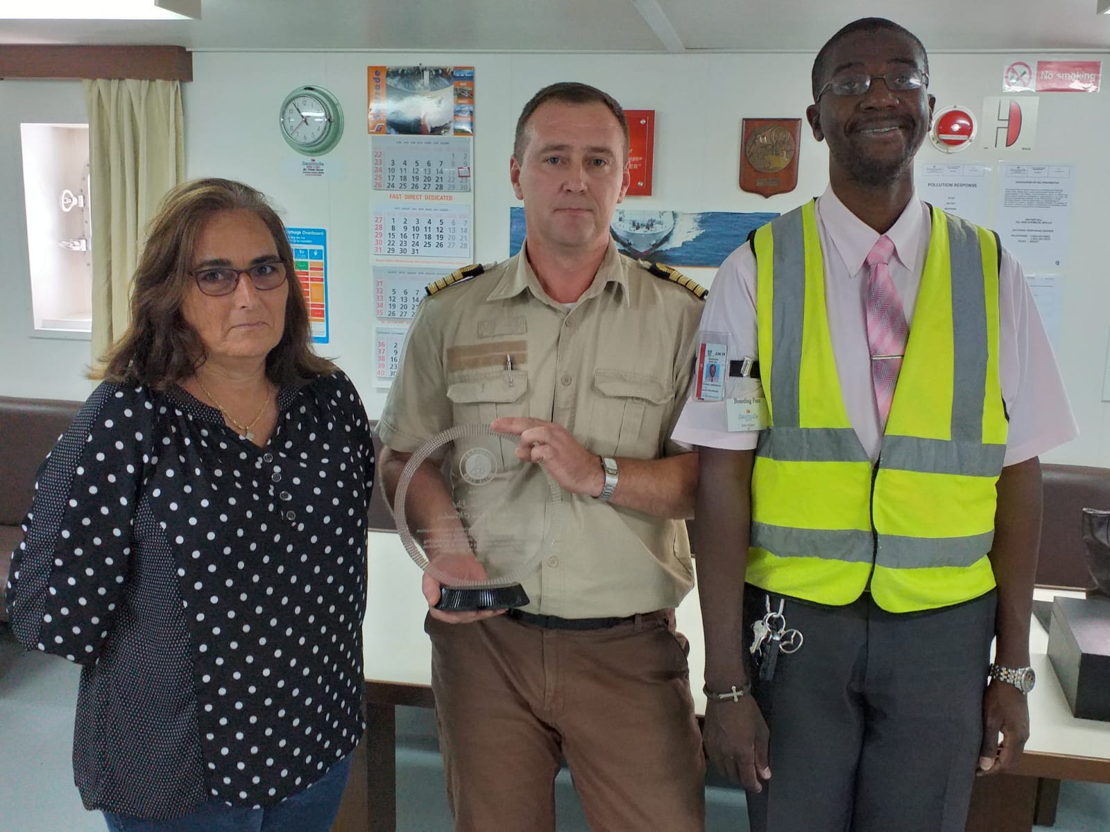 The presentation was made on the Geest Line freighter Baltic Klipper on its first voyage to the Bridgetown Port after Sol RB19. Rally Club Treasurer Jeanne Crawford, who had accepted the award on behalf of the shipping line during the post-event Prizegiving handed it on to ship’s captain Sergiy Moroz in the presence of local agent Raphael Carrington from Caribbean International Freight and Logistics Ltd and Sol RB Chairman Mark Hamilton.
