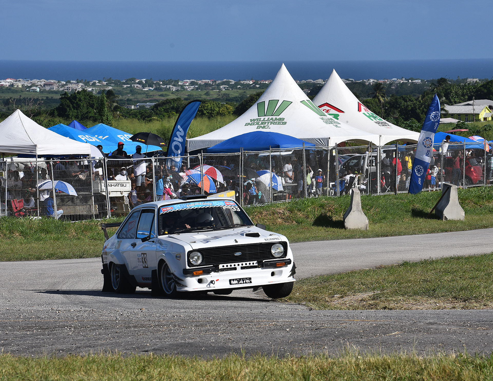 Just a couple of seconds adrift of Mayers, Andrew Jones (Herr’s Chips/AP Jones Pharmacy/Southern Surf Beach Apartments/Kepro Veterinary Solutions/Gales Agro/Weetabix/Java Island Coffee/Weetabix/The Shore Club Turks & Caicos/Hankook Ford Escort MkII) and Rhett Watson (Chefette/Stihl/Gliptone/Gunk/Leafy Organics/Hankook Tyres/Bajan Pure Water/Power King Batteries BMW M3) fought tooth and nail, Jones fractions ahead in all but the third run. They finished the day in that order separated by three-hundredths of a second, ninth and 10th overall, Jones remarking that he was “happy to be out driving the car at high speeds.”