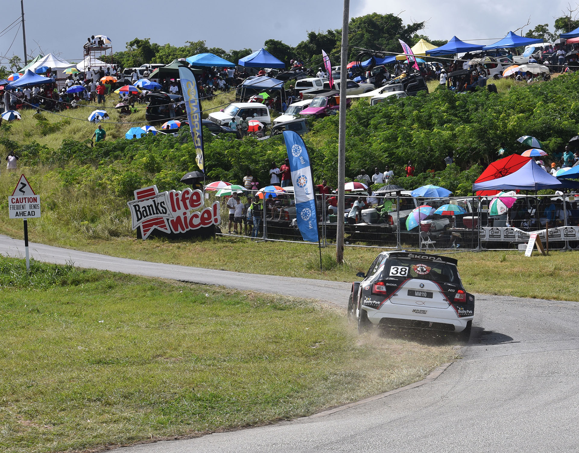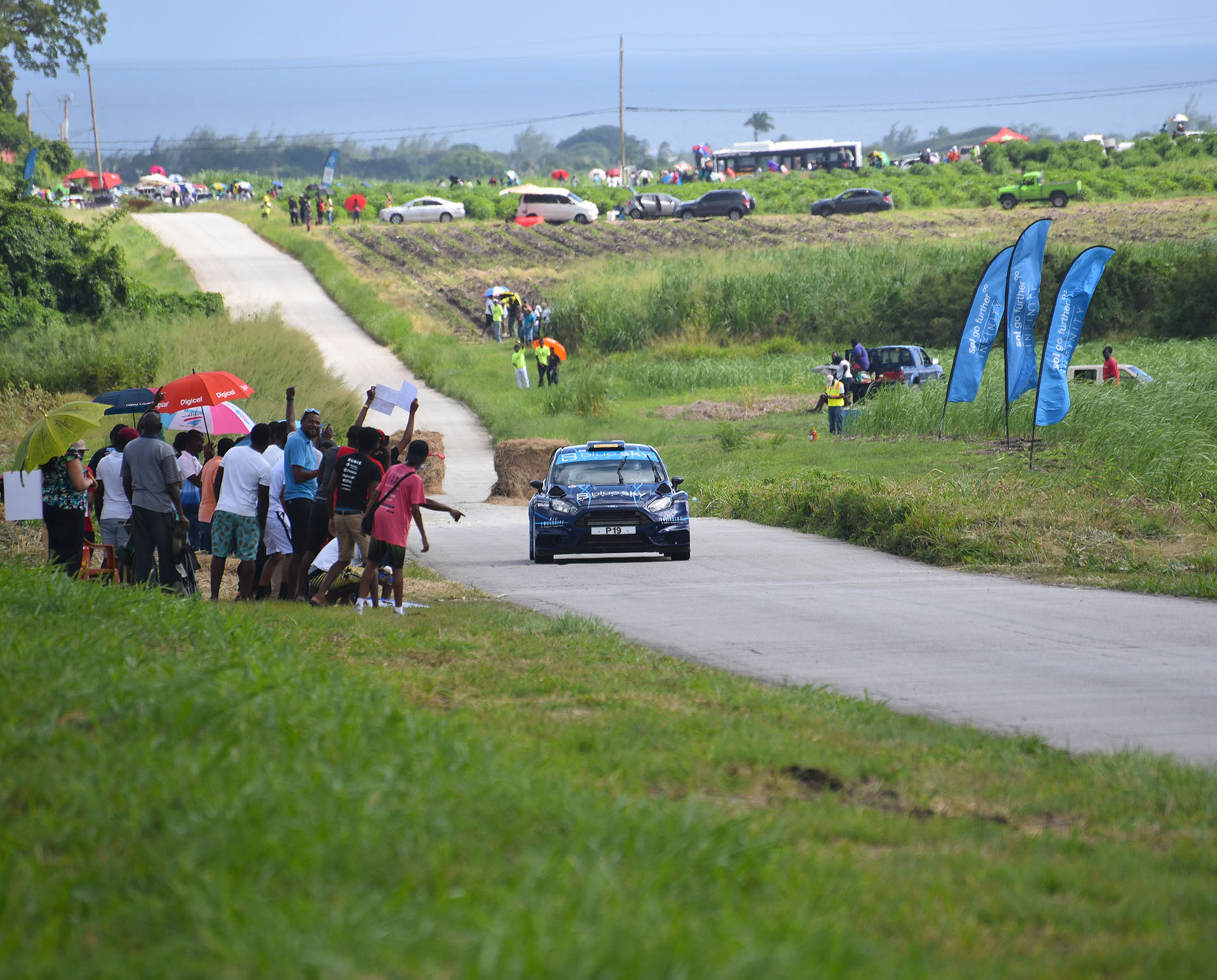 In glorious sunshine, thousands of fans headed to the south-east corner of the island to line the 3.3-kilometre route from Golden Grove to Stewart’s Hill, with Covid protocols much in evidence as the crowd followed the advice of the Barbados Rally Club (BRC) to Stay Safe, Stay Sanitized, Stay Distanced, Stay Masked, Stay Alert & Spectate Safely. To the accompaniment of ZR van-style horns, Roger Mayers and co-driver Sean Corbin warmed up the crowd in Car Zero ahead of the 42 competitors, who ran in reverse order of seeding, from Clubman up to WRC.