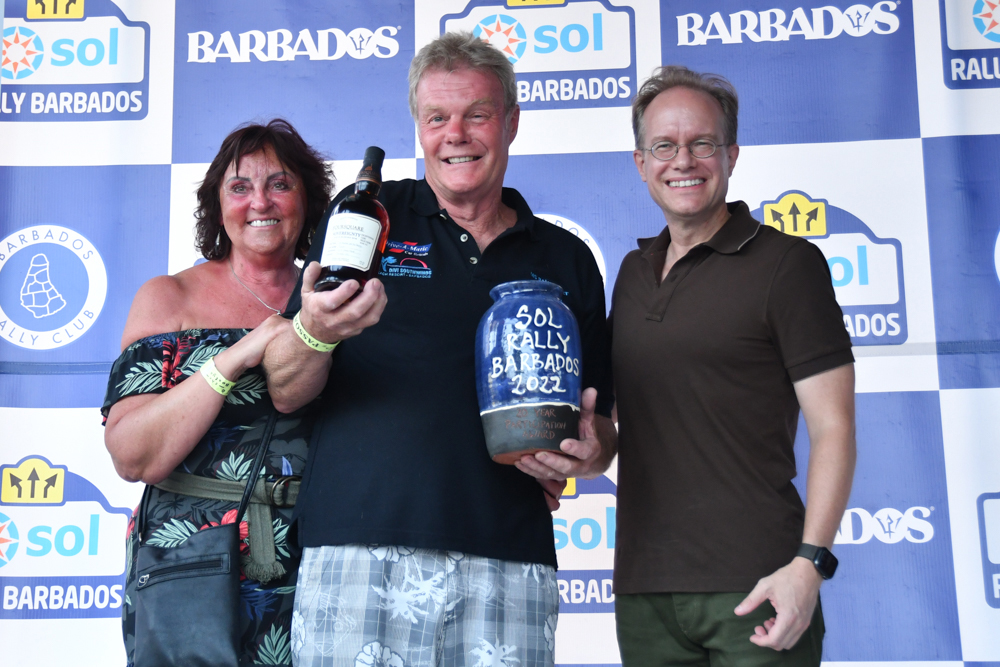 Three more overseas crews were called to the stage last evening, two of them newcomers: Ian and Cameron Barclay (Evo VI) came second to Thompson and Seabra in Modified 4, while Group B2 winners Andrew Graham and Gavin Neate not only won the hearts and minds of island fans with their astonishing Land Rover but also the first-ever Spirit of the Rally Award, which was presented by CEO of Barbados Tourism Marketing Inc (BTMI) Dr Jens Thraenhart. He also handed Martin and Glenis Stockdale awards to mark his 20th visit to compete in the region’s biggest motor sport international.